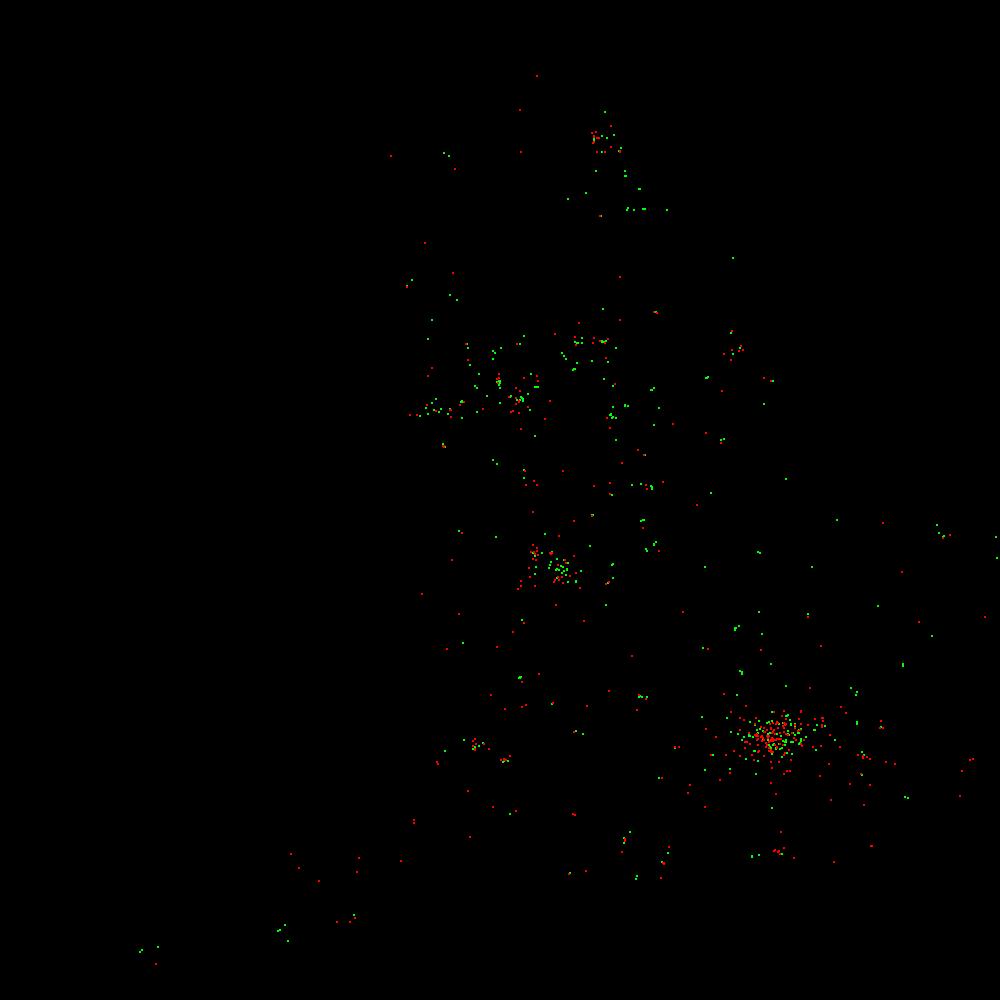 MAP 2: Green, 5% of clinics with the least inferred relative PD. red, 5% highest |